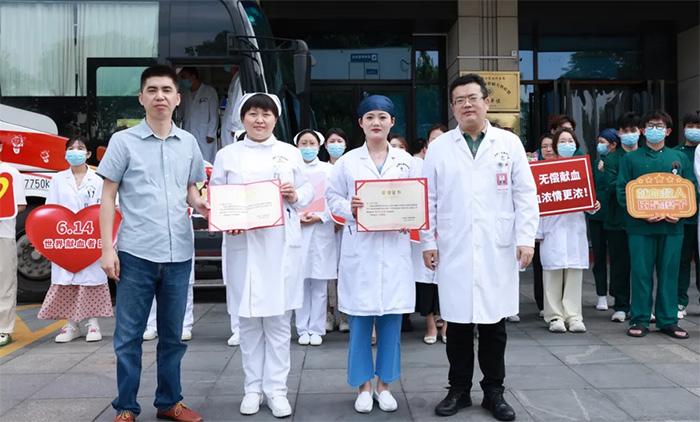 以典型為標(biāo)桿,以榜樣為力量。在醫(yī)院歷年組織的無償獻(xiàn)血活動中,涌現(xiàn)出一批常年堅(jiān)持無償獻(xiàn)血的愛心志愿者先鋒。為感謝他們“殷殷熱血顯擔(dān)當(dāng)”,鼓勵更多的職工關(guān)心、支持、參與無償獻(xiàn)血,醫(yī)院特授予神經(jīng)內(nèi)科總護(hù)士長、7A神經(jīng)內(nèi)三科護(hù)士長李楠楠,手術(shù)室護(hù)士王亞萍等“獻(xiàn)血功勛者”榮譽(yù)稱號。活動現(xiàn)場進(jìn)行了隆重表彰,閔行區(qū)健康促進(jìn)中心副主任朱斌、總經(jīng)理兼書記朱敏共同為他們頒發(fā)了榮譽(yù)證書。