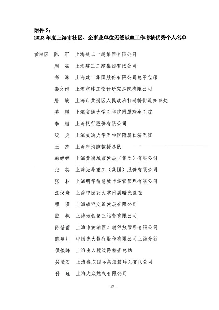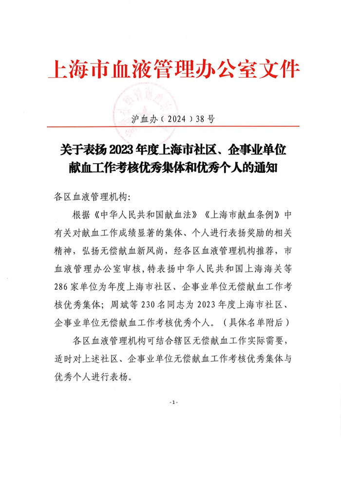 根據(jù)上海市血液管理辦公室發(fā)布《關(guān)于表?yè)P(yáng)2023年度上海市社區(qū)、企事業(yè)單位獻(xiàn)血工作考核優(yōu)秀集體和優(yōu)秀個(gè)人的通知》【滬血辦(2024)38號(hào)】,為弘揚(yáng)無(wú)償獻(xiàn)血新風(fēng)尚,經(jīng)各區(qū)血液管理機(jī)構(gòu)推薦,市血液管理辦公室審核,表?yè)P(yáng)全市286家單位為年度上海市社區(qū)、企事業(yè)單位無(wú)償獻(xiàn)血工作考核優(yōu)秀集體;上海藍(lán)十字腦科醫(yī)院【同濟(jì)大學(xué)附屬上海藍(lán)十字腦科醫(yī)院(籌)】醫(yī)務(wù)科朱細(xì)海科長(zhǎng)等230名同志為2023年度上海市社區(qū)、企事業(yè)單位無(wú)償獻(xiàn)血工作考核優(yōu)秀個(gè)人。