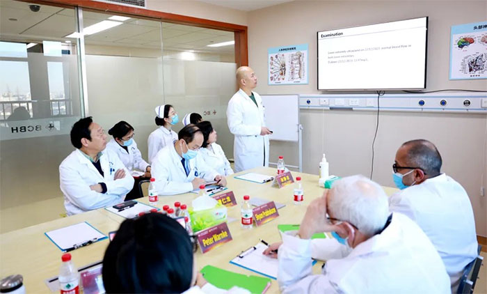 當(dāng)天下午,芝加哥大學(xué)醫(yī)學(xué)中心專家們與臨床科室開展了會診討論。副院長潘耀良,副院長周克祥,神經(jīng)內(nèi)科7A病區(qū)主任張靜波,醫(yī)院神經(jīng)外科學(xué)術(shù)副院長、神經(jīng)外科6A病區(qū)主任于耀宇,神經(jīng)外科6B病區(qū)主任潘仁龍,醫(yī)院學(xué)術(shù)副院長、神經(jīng)內(nèi)科4A病區(qū)主任席剛明教授,神經(jīng)內(nèi)科4A病區(qū)副主任王貴平博士以及部分青年醫(yī)生參加討論。
