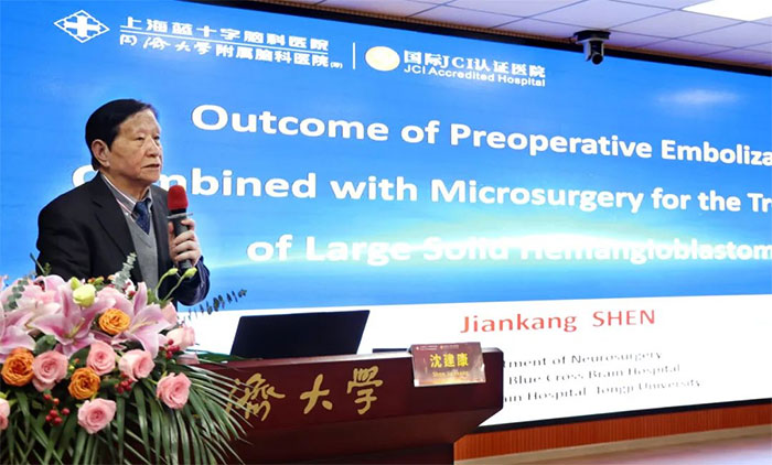 藍十字沈建康教授作為第一位講者,作了《術(shù)前栓塞聯(lián)合顯微手術(shù)治療大實體性血管母細胞瘤的療效觀察》報告分享。他以6例臨床典型病例為切入點,結(jié)合國內(nèi)外相關(guān)研究,分享臨床經(jīng)驗及心得體會,指出術(shù)前栓塞確為減少LSHB術(shù)中出血的有效方法。