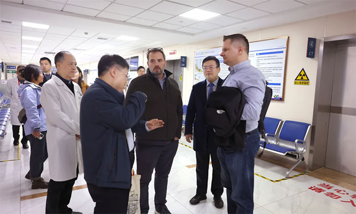 Dean Krusienski博士、Gerwin Schalk博士、金晶教授一行抵達醫(yī)院后,在朱敏書記、項耀鈞院長等的陪同下,實地參觀考察了醫(yī)院康復(fù)醫(yī)學(xué)科、高壓氧科、醫(yī)學(xué)影像科等重點特色科室,并與科室主任及醫(yī)護人員進行了互動交流。