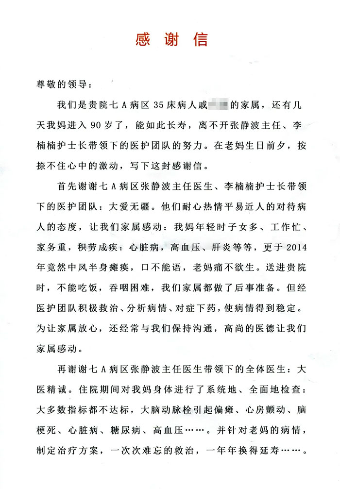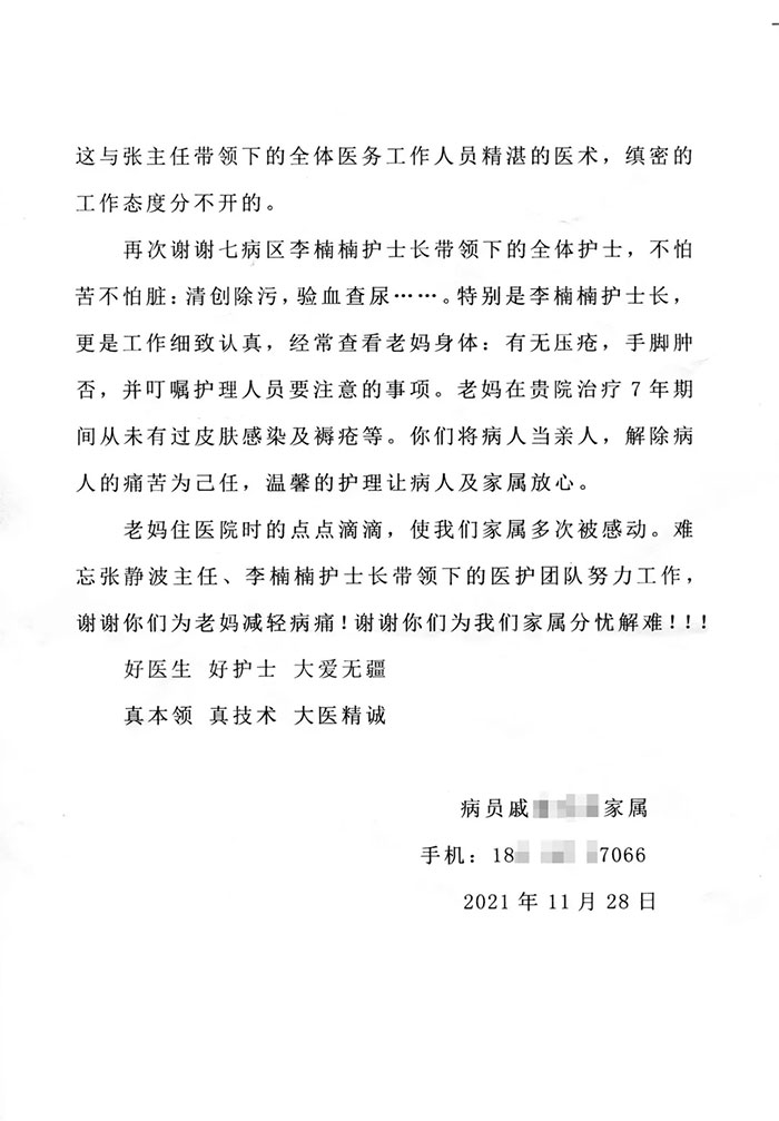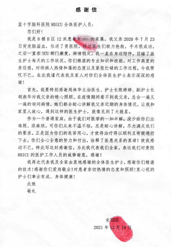 重拾健康,患者的感謝就是最美的勛章。真摯的情意灑落紙間,烙燙進(jìn)每一位醫(yī)護(hù)人員的心田。無(wú)論是6A神經(jīng)外科病區(qū)醫(yī)護(hù)團(tuán)隊(duì),7B腦血管病科團(tuán)隊(duì),還是8B神經(jīng)內(nèi)科重癥監(jiān)護(hù)室的全體醫(yī)護(hù),在12月這個(gè)冬季,感受到的不只是寒冷,還有來(lái)自患者的“暖陽(yáng)”。