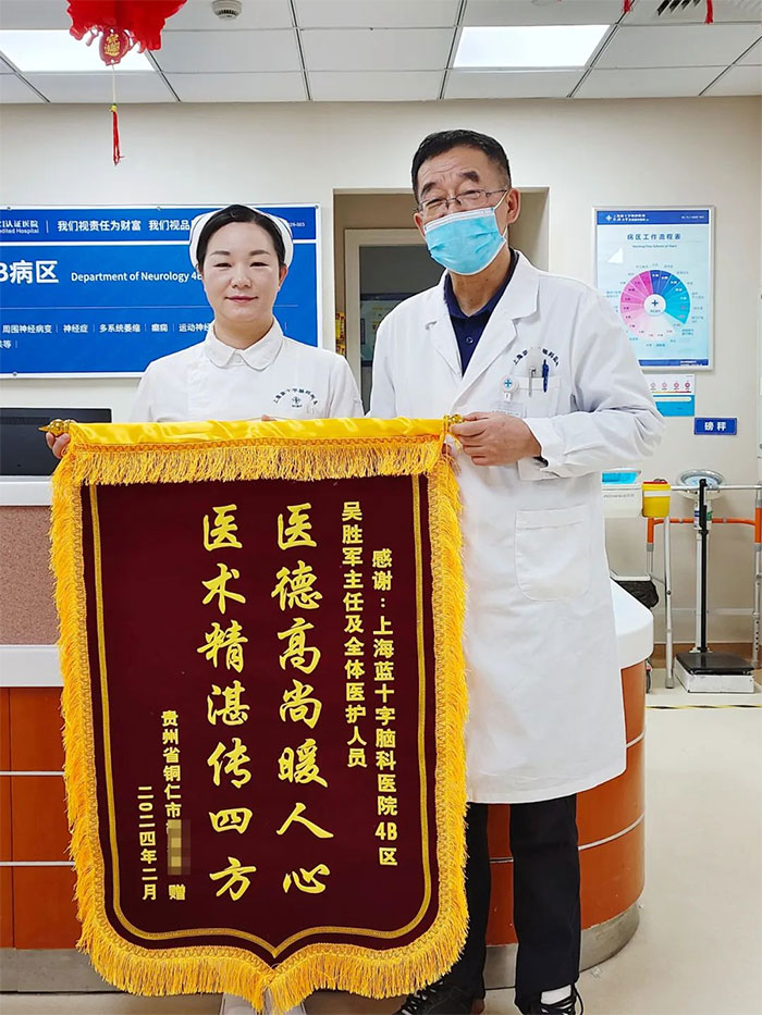 朱老伯為腦干及雙側(cè)大腦半球多發(fā)腔隙性腦梗塞患者,昏迷,病情反復(fù),甚至一度危及生命。經(jīng)急診、李振并主任團隊及多學(xué)科專家力挽狂瀾,精心救治。如今,朱老伯不僅蘇醒,肢體功能也日漸向好。“當(dāng)時一定要120救護車送來醫(yī)藍(lán)十字搶救,現(xiàn)在看來是對的!”朱老伯動情地表示,并分別為急診科和5A團隊送來錦旗和書法牌匾。原來,朱老伯妻子曾在李振并主任處診治,對醫(yī)院的專業(yè)能力和服務(wù)質(zhì)量非常認(rèn)可,當(dāng)時家屬便堅持要求120將朱老伯送來藍(lán)十字,遂有了朱老伯這番感慨。