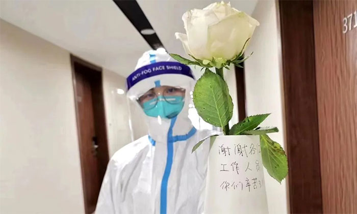 兩個月后,再見趙姐。她說,每每站在布撒陽光的過道,看著空氣中漂浮的塵埃,總感覺時間在這里停止了。隔離酒店的一個個單元,就像一座座孤島,而我們就像那束光,照亮著孤島上的人們,引領(lǐng)他們回家。