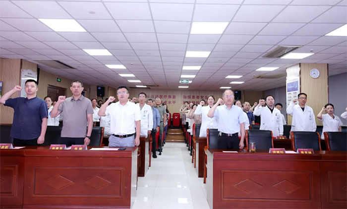 在周克祥副院長的領(lǐng)誓下,全場(chǎng)起立,高舉右拳,目光堅(jiān)定,共同重溫了神圣的《中國醫(yī)師宣誓誓詞》。鏗鏘有力的誓言回蕩在會(huì)場(chǎng),表達(dá)了全體醫(yī)務(wù)工作者對(duì)敬佑生命、救死扶傷的堅(jiān)定信念和不變初心。