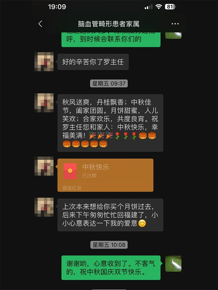 “已經(jīng)記不清這是第幾次過節(jié)值班了。”這個假期,門診部、客服部主任羅佳仍然忙碌在門診,“對于我來說,作為門診工作人員,過節(jié)跟不過節(jié)是一樣的。因為生病是不分時間的,到醫(yī)院看病的患者任何時候都需要工作人員的幫助。”她的付出得到了患者及家屬的認可。中秋節(jié)這天,一位來自福建的腦血管病畸形患者的家屬通過微信向羅佳送上節(jié)日祝福之際,發(fā)送了微信紅包,表示,希望用微信紅包“小小心意表達愛意”,彌補因匆忙趕回福建未能購買月餅贈送的遺憾。羅佳沒有接收紅包,表示實實在在感受到了患者及家屬的心意,這便是假期最好的“節(jié)日禮物”。