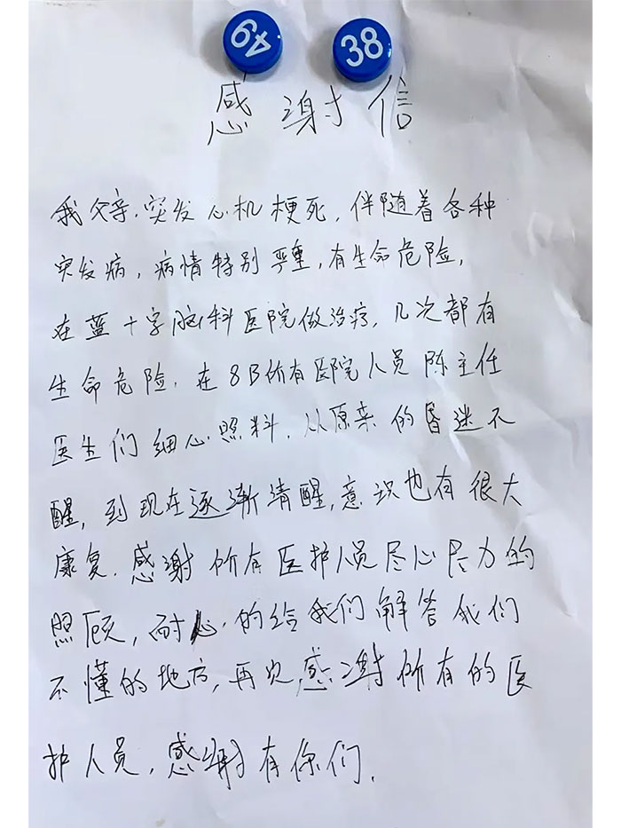 該患者幾度病情危重,陳泥主任帶領(lǐng)團(tuán)隊(duì)精心救治,使其化險(xiǎn)為夷、轉(zhuǎn)危為安。治療過(guò)程中,家屬十分焦慮,陳泥副主任不僅就治療方案與家屬耐心溝通,還總是百忙之中加以勸慰安撫,讓家屬倍感溫暖。于是手寫(xiě)了感謝信送給陳泥副主任及醫(yī)護(hù)表示由衷感謝。