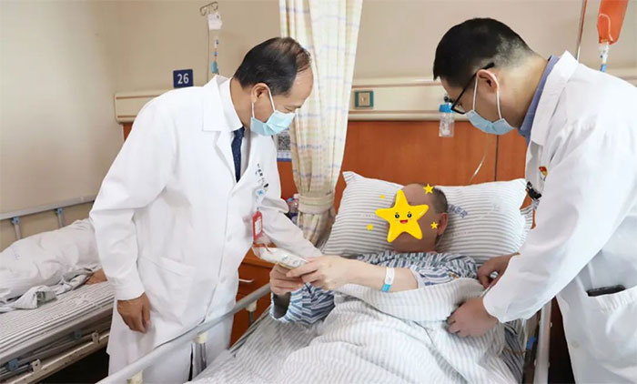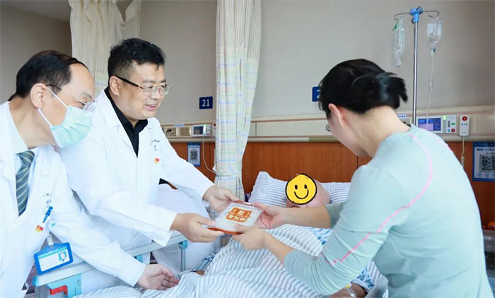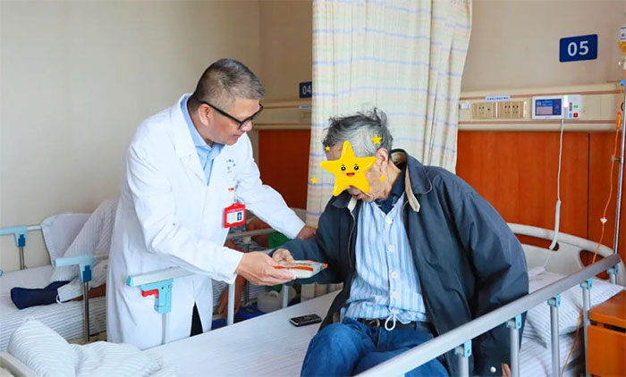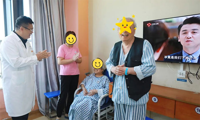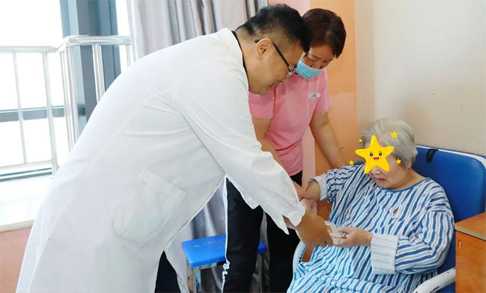 6A病區(qū)的金奶奶是一名退休教師,因腦梗死、骨折等入住醫(yī)院,入院時臥床、生活不能自理、不識人,一度病危,經過精心救治、護理及康復,如今已能下床行走,也能認得親友。在中國傳統(tǒng)節(jié)日重陽節(jié)收到朱敏總經理送來的重陽糕和慰問,金奶奶及家屬十分感動。“感謝院領導的關心,想得這么周到;感謝醫(yī)生護士的精心照護。謝謝!”金奶奶的家屬說到。在親友的鼓勵下,金奶奶現(xiàn)場吟誦了王維的詩歌《九月九日憶山東兄弟》。