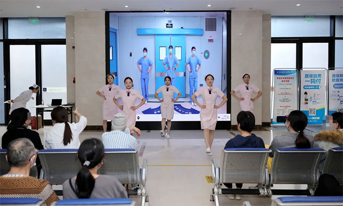 為進(jìn)一步增強(qiáng)科普效果,活動(dòng)還設(shè)置視頻展播與互動(dòng)教學(xué)環(huán)節(jié)。上海藍(lán)十字腦科醫(yī)院5A神經(jīng)內(nèi)二科李蘭馨護(hù)士長(zhǎng)團(tuán)隊(duì)帶來曾獲2024年閔行區(qū)護(hù)理科普講解大賽三等獎(jiǎng)的科普作品《動(dòng)起來,不要被“栓”住》。該作品以真實(shí)案例為切入點(diǎn),通過生動(dòng)視頻畫面與通俗解說,將專業(yè)血栓知識(shí)轉(zhuǎn)化為易懂的生活常識(shí)。隨后,李蘭馨護(hù)士長(zhǎng)團(tuán)隊(duì)現(xiàn)場(chǎng)演示“預(yù)防深靜脈血栓操”,并帶領(lǐng)觀眾跟練。現(xiàn)場(chǎng)氣氛活躍,不少患者反饋:“動(dòng)作簡(jiǎn)單實(shí)用,在床上就能練習(xí),非常方便!”