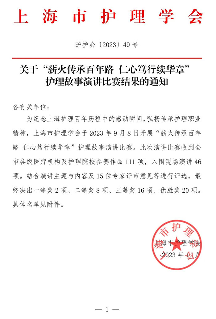 今年是上海市護理學會成立一百周年。為紀念上海護理百年歷程中的感動瞬間,弘揚傳承護理職業(yè)精神,上海市護理學會組織開展了“薪火傳承百年路 仁心篤行續(xù)華章”護理故事演講比賽。來自全市111項參賽作品進入初賽,入圍現(xiàn)場演講46項。結(jié)合演講主題與內(nèi)容及15位專家評審意見等,上海藍十字腦科醫(yī)院腦血管病科護士蔣新晨榮獲比賽三等獎。