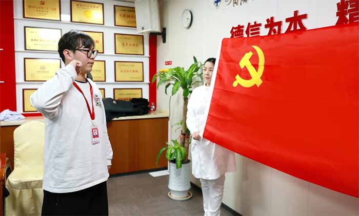 全體與會黨員整齊肅立,共同回望奮斗歷程,堅定理想信念。在朱敏書記的領(lǐng)誓下,預(yù)備黨員盧盟杰佩戴黨徽,面向鮮紅的中國共產(chǎn)黨黨旗,舉起右拳莊嚴宣誓:“我志愿加入中國共產(chǎn)黨,擁護黨的綱領(lǐng),遵守黨的章程……”鏗鏘有力的誓言回蕩在會議室,不僅表達了盧盟杰同志對黨的無限忠誠和為共產(chǎn)主義事業(yè)奮斗終身的堅定決心,也讓在場每一位黨員再次接受了深刻的精神洗禮。