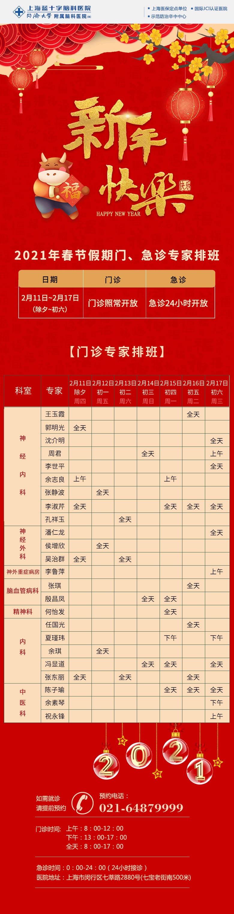 金牛賀歲,迎祥納瑞。在2021年新春來臨之際,上海藍十字腦科醫(yī)院在此感謝您一直以來的信任與支持!我院將繼續(xù)努力,一如既往地為百姓提供優(yōu)質(zhì)高效的醫(yī)療服務,用赤誠初心守護群眾健康!