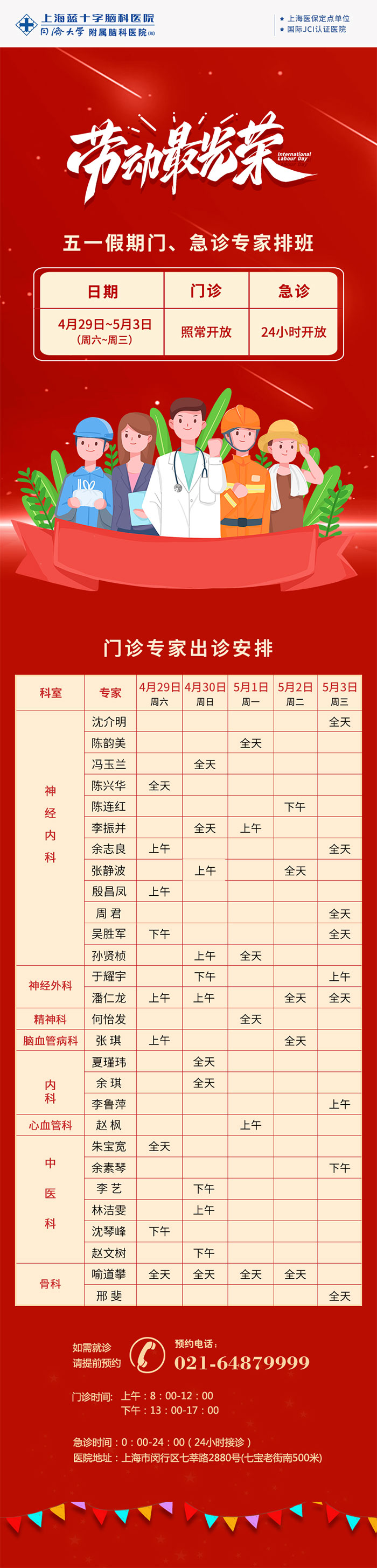 2023年“五一”假期即將到來(lái),為方便廣大市民朋友就診,我院五一勞動(dòng)節(jié)放假期間(4月29日至5月3日),門、急診照常開診。具體排班公告如下: