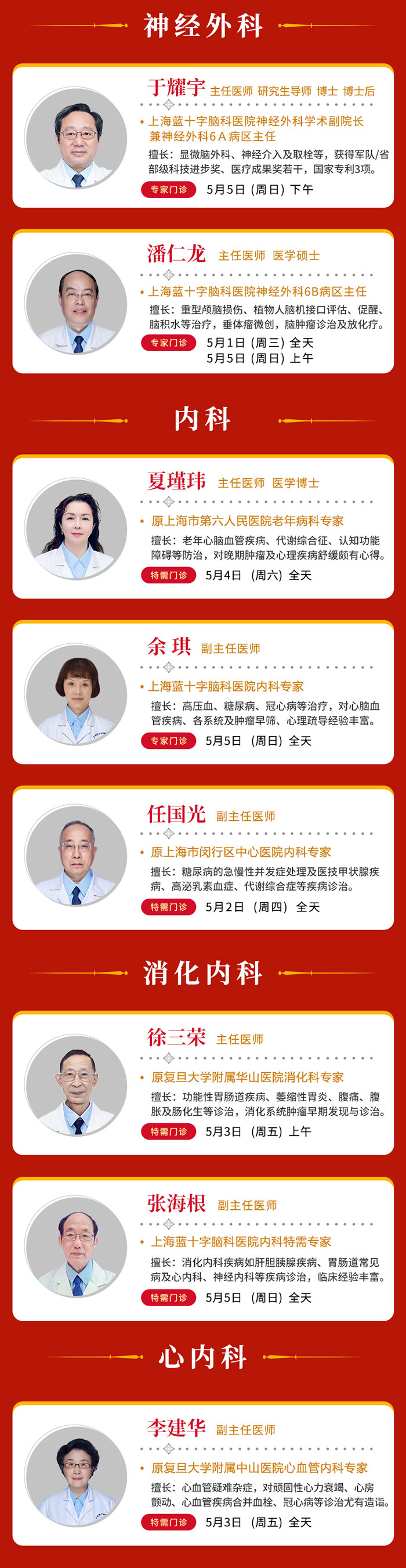為更好滿足廣大市民朋友的就醫(yī)需求,根據(jù)國務(wù)院有關(guān)法定假日安排的規(guī)定,結(jié)合上海藍(lán)十字腦科醫(yī)院實(shí)際情況,2024年“五一”勞動(dòng)節(jié)假期(5月1日—5日)期間醫(yī)院門、急診照常開診。具體排班公告如下: