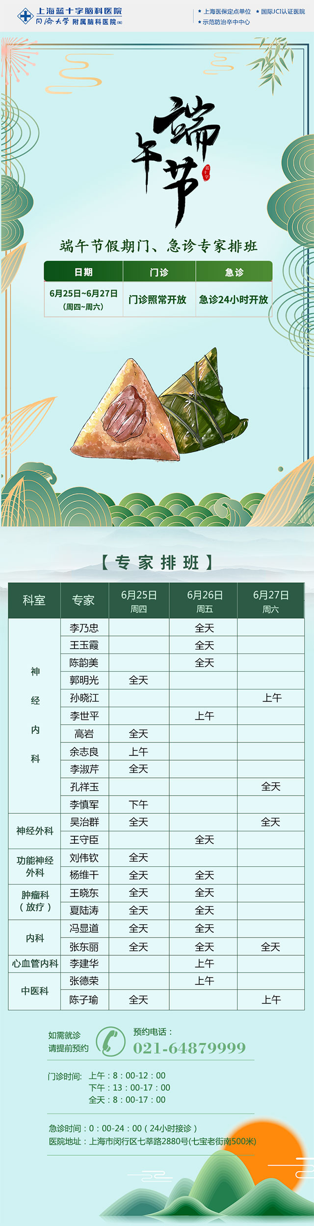 為了滿(mǎn)足您在節(jié)假日期間的就醫(yī)需求,在今年端午節(jié)期間,即6月25日(周四)—6月27日(周六),我院門(mén)、急診照常開(kāi)診,各檢查項(xiàng)目照常開(kāi)放。具體門(mén)、急診安排如下: