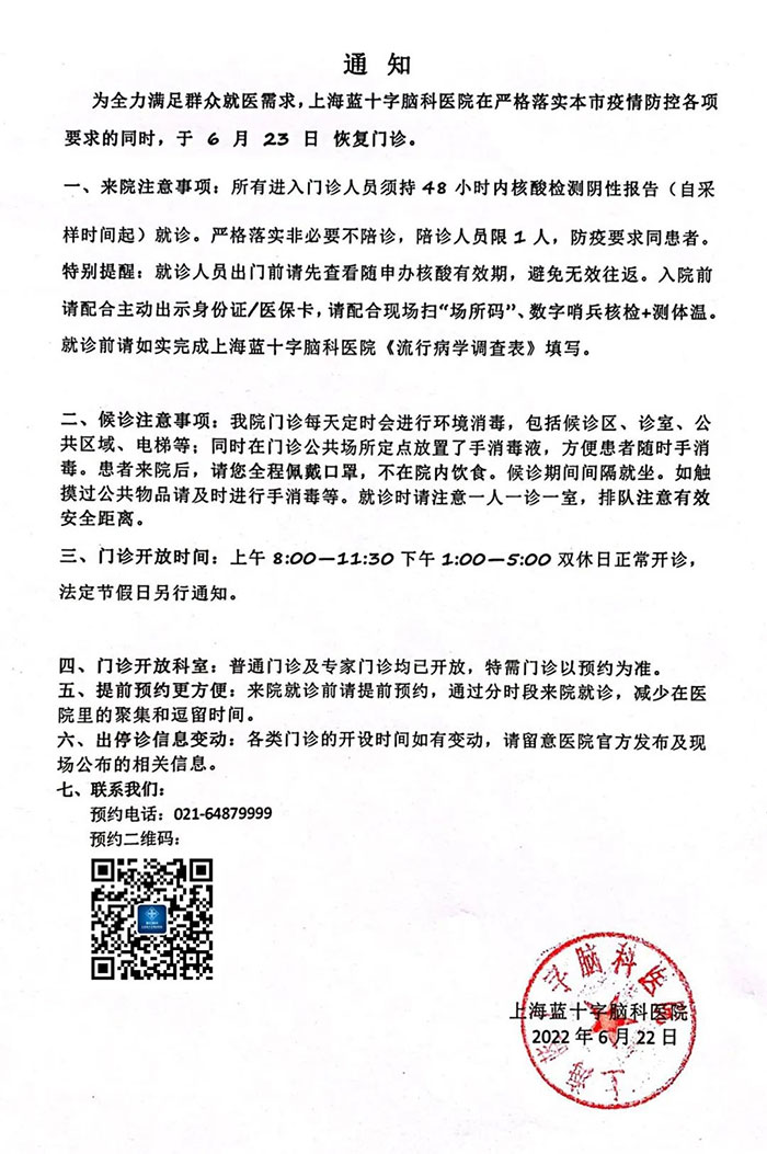 根據(jù)國家和本市疫情防控要求,經(jīng)上級主管部門批準,自2022年6月23日上午8時起,上海藍十字腦科醫(yī)院恢復(fù)門診服務(wù)工作。