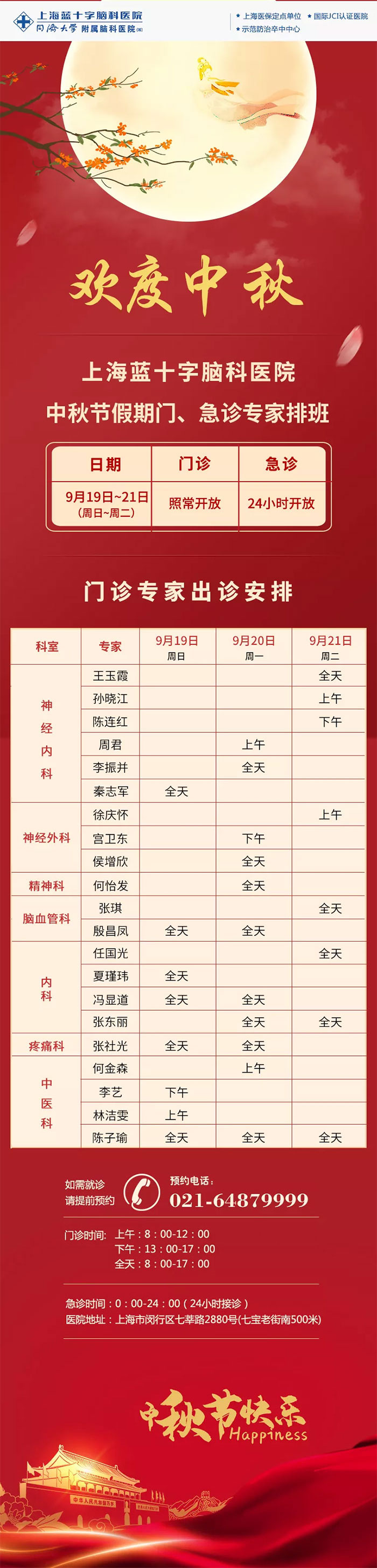溫馨提示:進(jìn)入醫(yī)院需出示隨申碼、行程碼、測(cè)量體溫、配合醫(yī)院做好流調(diào),全程佩戴口罩。新住院患者及陪護(hù)需出示3日內(nèi)核酸檢測(cè)陰性報(bào)告辦理住院。因假期就診人數(shù)較多,建議您關(guān)注上海藍(lán)十字腦科醫(yī)院微信公眾號(hào)或撥打預(yù)約電話(021-64879999)提前預(yù)約,以減少您的排隊(duì)等候時(shí)間。預(yù)祝大家中秋節(jié)快樂(lè),萬(wàn)事如意,闔家安康!