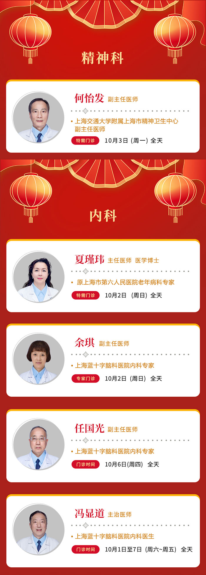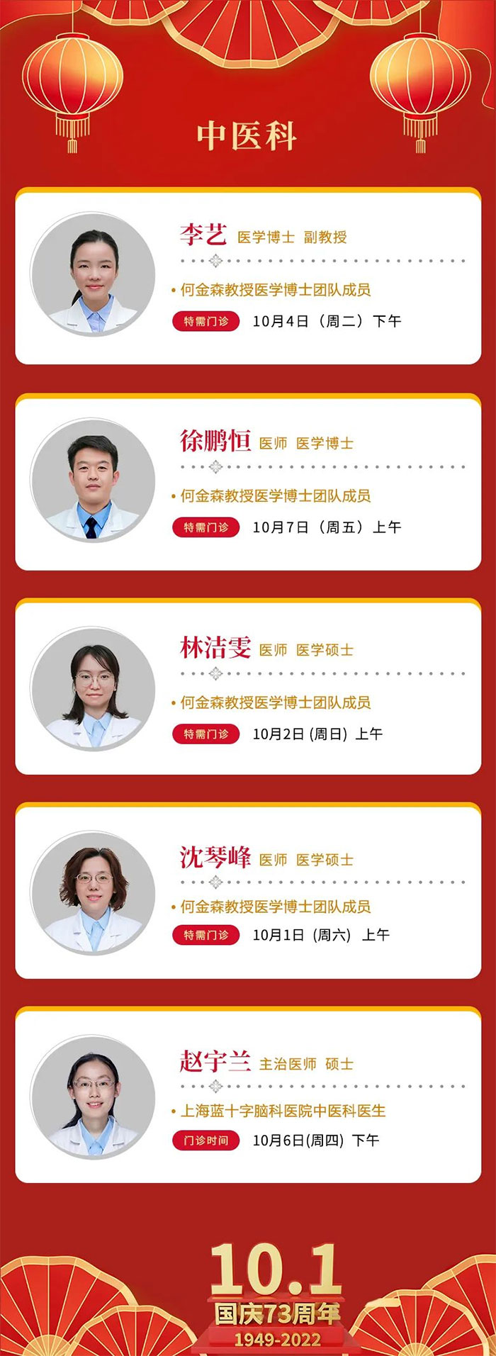 國慶將至,根據(jù)《國務(wù)院辦公廳關(guān)于2022年部分節(jié)假日安排的通知》,在切實做好疫情防控工作的同時,為保障群眾就醫(yī)需求,我院門診照常開放。望各位患友按照上海市疫情防控要求,提前規(guī)劃行程,做好出行安排,盡量預(yù)約就診。詳細門診安排如下: