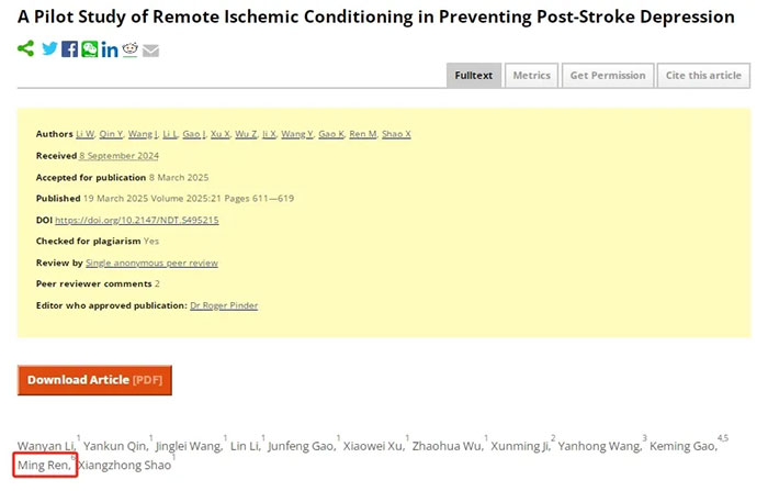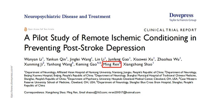 此次任明博士參與發(fā)表的論文題為“A Pilot Study of Remote Ischemic Conditioning in Preventing Post-Stroke Depression”(遠(yuǎn)隔缺血預(yù)適應(yīng)治療預(yù)防卒中后抑郁癥的初步研究)。該論文于2025年3月19日正式發(fā)布。