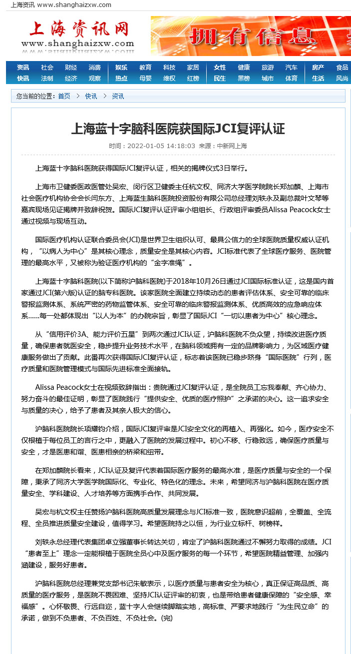 上海藍十字腦科醫(yī)院獲得國際JCI復(fù)評認證,相關(guān)的揭牌儀式3日舉行。