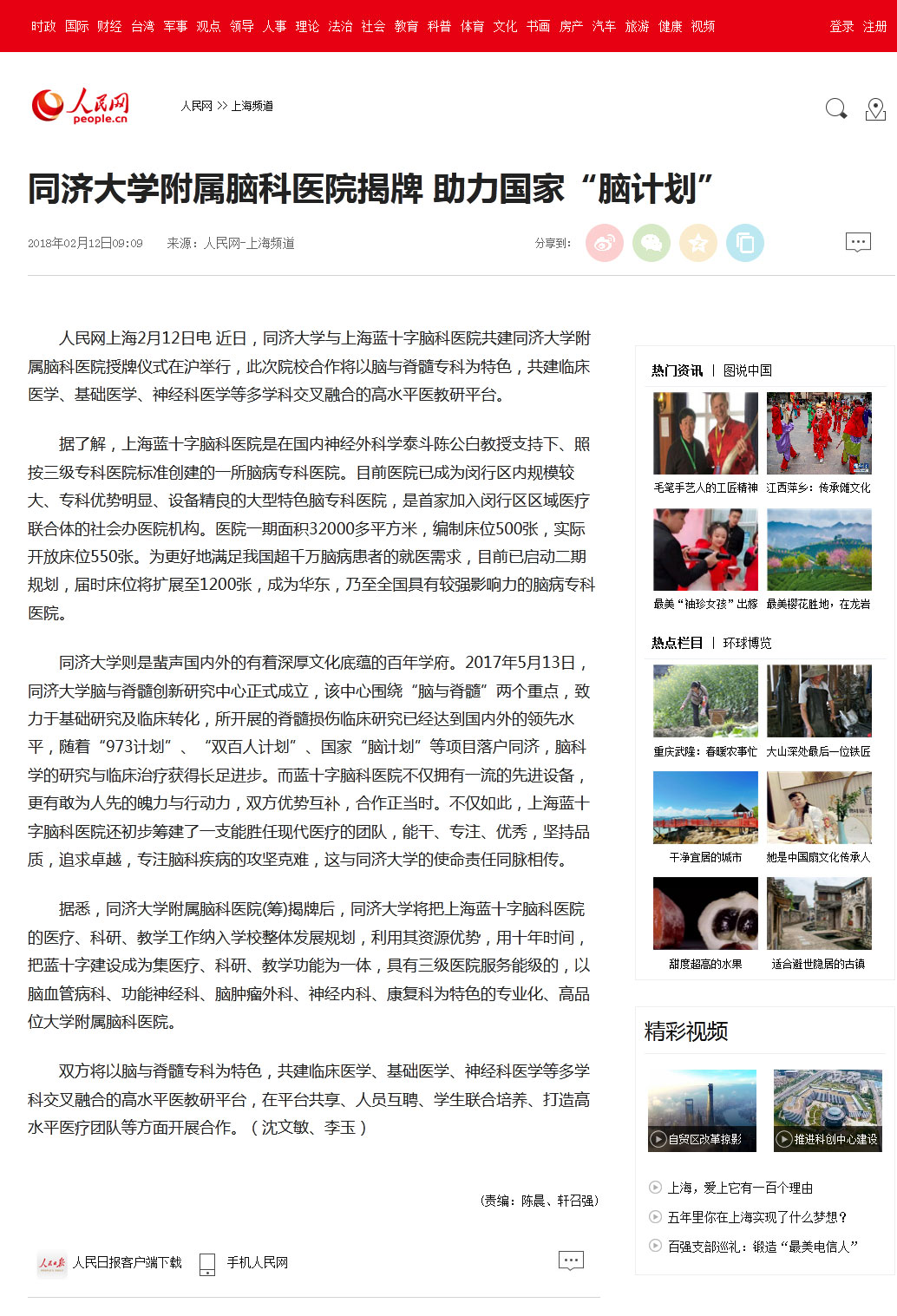 人民網(wǎng)上海2月12日電 近日,同濟(jì)大學(xué)與上海藍(lán)十字腦科醫(yī)院共建同濟(jì)大學(xué)附屬腦科醫(yī)院授牌儀式在滬舉行,此次院校合作將以腦與脊髓?茷樘厣步ㄅR床醫(yī)學(xué)、基礎(chǔ)醫(yī)學(xué)、神經(jīng)科醫(yī)學(xué)等多學(xué)科交叉融合的高水平醫(yī)教研平臺(tái)。