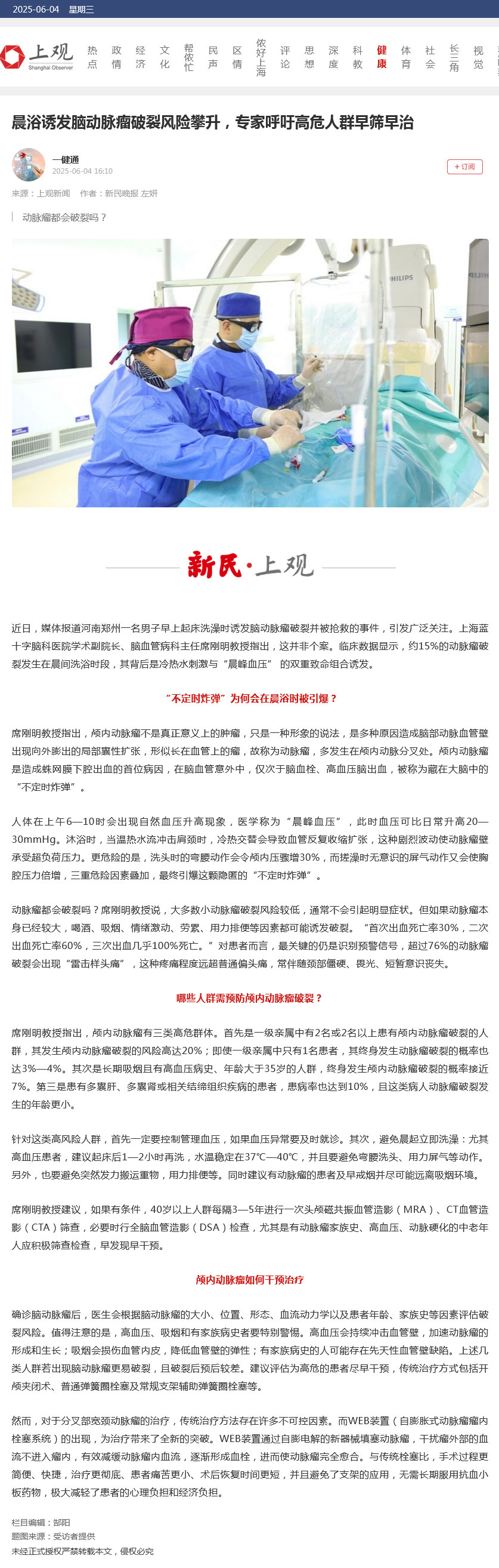 近日,媒體報(bào)道河南鄭州一名男子早上起床洗澡時(shí)誘發(fā)腦動(dòng)脈瘤破裂并被搶救的事件,引發(fā)廣泛關(guān)注。上海藍(lán)十字腦科醫(yī)院學(xué)術(shù)副院長(zhǎng)、腦血管病科主任席剛明教授指出,這并非個(gè)案。臨床數(shù)據(jù)顯示,約15%的動(dòng)脈瘤破裂發(fā)生在晨間洗浴時(shí)段,其背后是冷熱水刺激與“晨峰血壓” 的雙重致命組合誘發(fā)。
