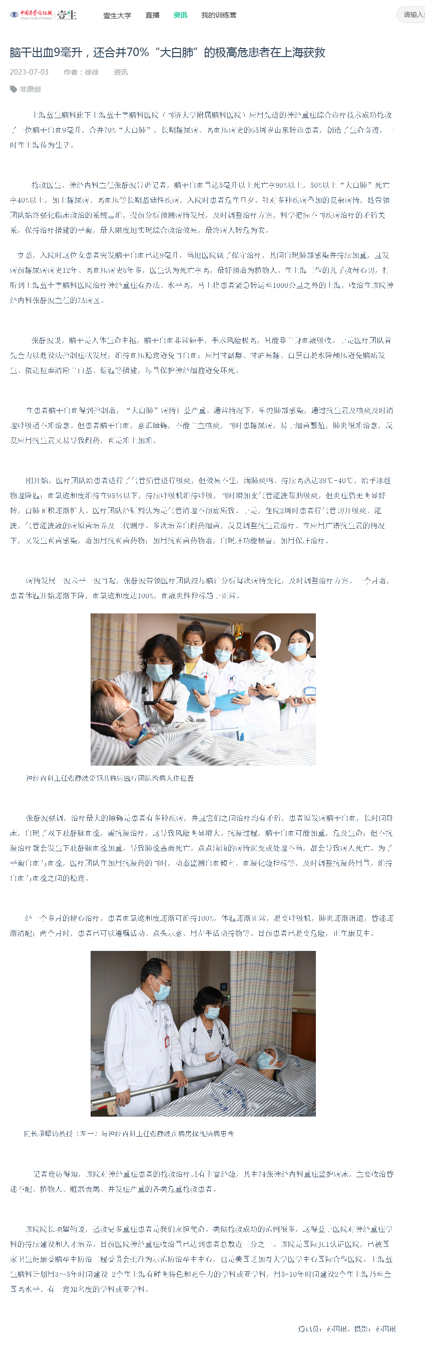 上海藍(lán)生腦科旗下上海藍(lán)十字腦科醫(yī)院應(yīng)用先進(jìn)的神經(jīng)重癥綜合診療技術(shù)成功搶救了一位腦干出血9毫升,合并70%“大白肺”,長期糖尿病、高血壓病史的65周歲山東轉(zhuǎn)診患者,創(chuàng)造了生命奇跡,一時在上海傳為佳話。