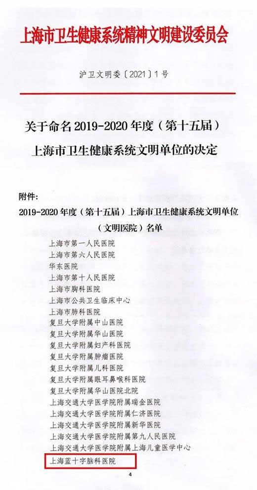 梁長玉報道 近日,上海市衛(wèi)生健康系統(tǒng)精神文明建設(shè)委員會發(fā)布了“關(guān)于命名2019—2020年度(第十五屆)上海市衛(wèi)生健康系統(tǒng)文明單位的決定”的文件,上海藍十字腦科醫(yī)院榜上有名,這是上海藍十字腦科醫(yī)院連續(xù)兩屆榮獲“上海市衛(wèi)生健康系統(tǒng)文明單位稱號”!