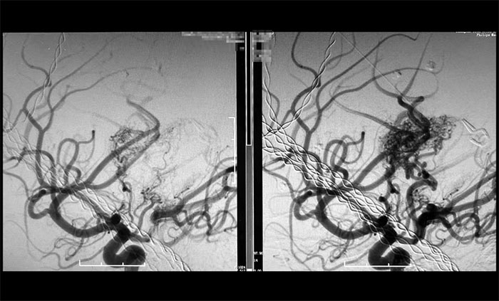 巨大腦動靜脈畸形(右),被順利栓塞(左)
