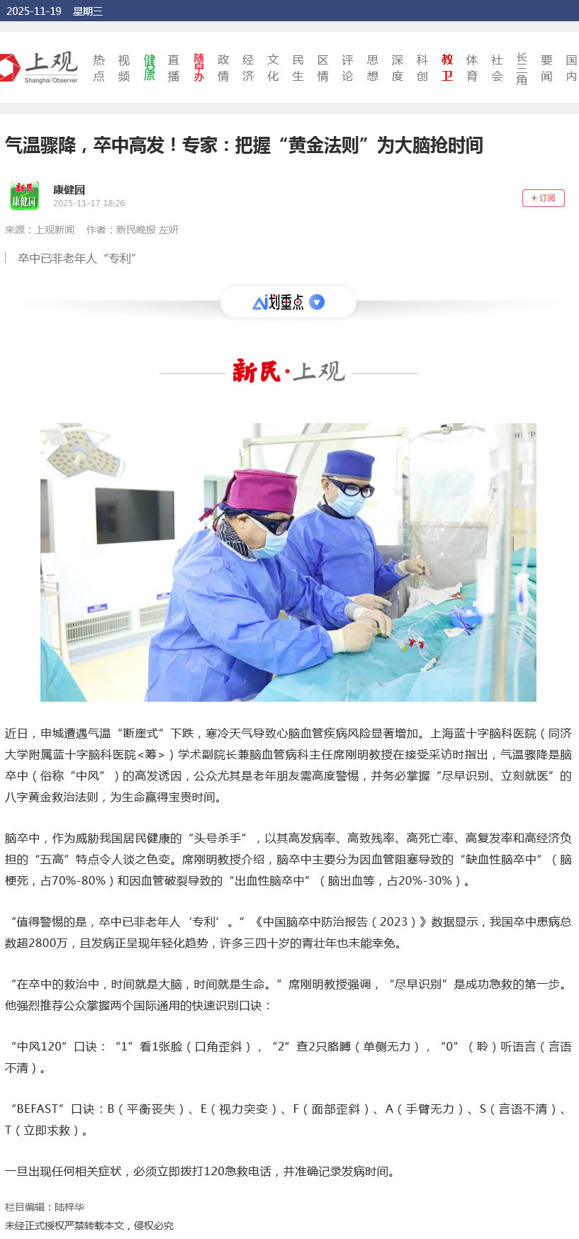 近日,申城遭遇氣溫“斷崖式”下跌,寒冷天氣導致心腦血管疾病風險顯著增加。上海藍十字腦科醫(yī)院(同濟大學附屬藍十字腦科醫(yī)院<籌>)學術副院長兼腦血管病科主任席剛明教授在接受采訪時指出,氣溫驟降是腦卒中(俗稱“中風”)的高發(fā)誘因,公眾尤其是老年朋友需高度警惕,并務必掌握“盡早識別、立刻就醫(yī)”的八字黃金救治法則,為生命贏得寶貴時間。