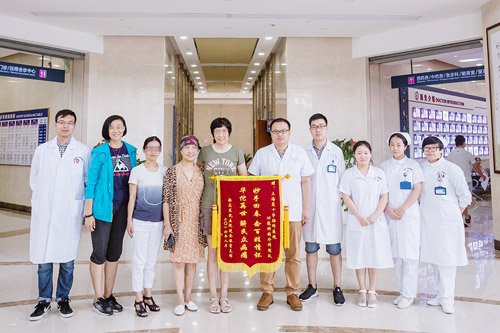 沈建康教授精湛的醫(yī)術吸引了很多患者慕名而來,其中就包括了女排教練唐女士。唐女士患面肌痙攣疾病多年,輾轉了多家醫(yī)院,治療效果也不明顯,最后,轉入上海藍十字醫(yī)院找到沈建康教授尋求治療,沈教授為唐女士行“左側面神經微血管減壓術”,術后唐女士面部抽搐癥狀立即消失,面肌痙攣疾病得以成功治療。為此,周鹿敏專程赴藍十字醫(yī)院送上錦旗表示感謝。