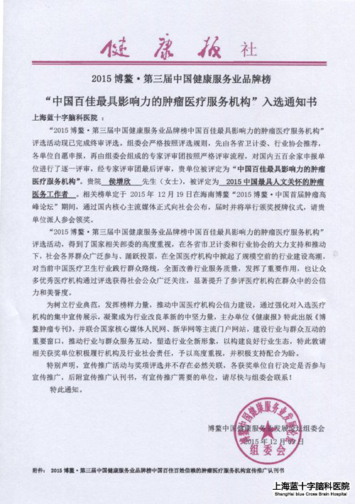 據(jù)悉,上海藍(lán)十字腦科醫(yī)院曾在2014年12月5日~8日召開的“2014博鰲·第二屆中國健康服務(wù)業(yè)大會”上獲得“中國醫(yī)療機(jī)構(gòu)公信力示 范單位”稱號。2015年接近年尾,藍(lán)十字腦科醫(yī)院再度在博鰲·中國健康服務(wù)業(yè)論壇上斬獲大獎,不僅體現(xiàn)出社會各界對藍(lán)十字腦科醫(yī)院出色的專家團(tuán)隊、診療 技術(shù)、治療水平以及在回饋社會、擔(dān)當(dāng)責(zé)任方面的肯定與鼓勵,更體現(xiàn)出藍(lán)十字腦科醫(yī)院的精益求精、不斷超越,上海藍(lán)十字腦科醫(yī)院在群眾中的公信力和美譽度進(jìn) 一步提升。