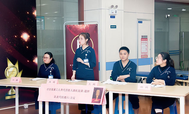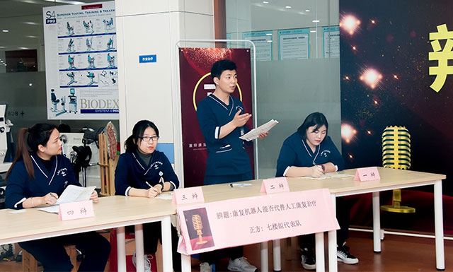 本次辯論賽主要分為三組,共6個(gè)代表隊(duì)(三個(gè)正方和三個(gè)反方)參加,主要圍繞康復(fù)醫(yī)學(xué)的三個(gè)熱點(diǎn)議題——1.康復(fù)機(jī)器人能否代替人工康復(fù)治療;2.康復(fù)醫(yī)學(xué)科是否要設(shè)立康復(fù)病房;3.根據(jù)我院情況需要OT、PT復(fù)合型治療師還是獨(dú)立型治療師,展開激烈的角逐。