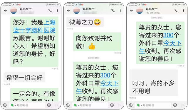 蘇總特意用短信回復(fù)了這位愛(ài)心女士說(shuō),收到了300個(gè)外科口罩,并詢(xún)問(wèn)其身份要表示感謝;可是她只是表示“呵呵,寄的不多,不用謝”“微薄之力”、“希望一切會(huì)好”等。