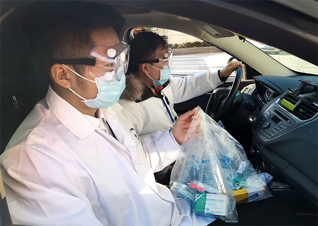 ▲ 醫(yī)院社工部魏磊和吳高偉出發(fā)送藥