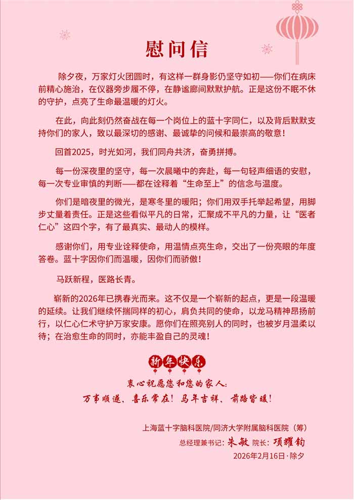 除夕夜,申城萬家燈火。當(dāng)整座城市沉浸在團(tuán)圓的暖意中,上海藍(lán)十字腦科醫(yī)院依然燈火通明。手術(shù)室的無影燈亮著,走廊里的腳步?jīng)]停,值班室的電話不時響起。這是無數(shù)個除夕夜中,尋常又不尋常的一夜。尋常的是,這里從未停止運轉(zhuǎn);不尋常的是,在這一天,堅守被賦予了更重的分量。