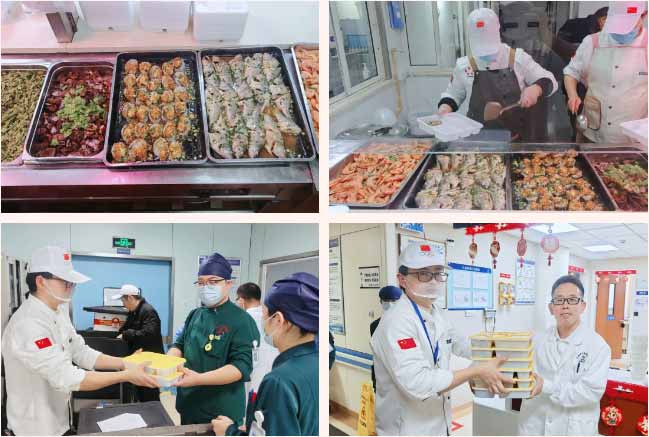 醫(yī)院后勤食堂的師傅們,同樣沒有回家。灶火燃起,鍋鏟翻飛,一份份熱騰騰的年夜飯打包送出,被送往急診與病區(qū),送到了每一個無法回家吃年夜飯的藍(lán)十字人手中。沒有山珍海味,卻盛滿了醫(yī)院深切的牽掛、無言的關(guān)愛和美好的祝愿。