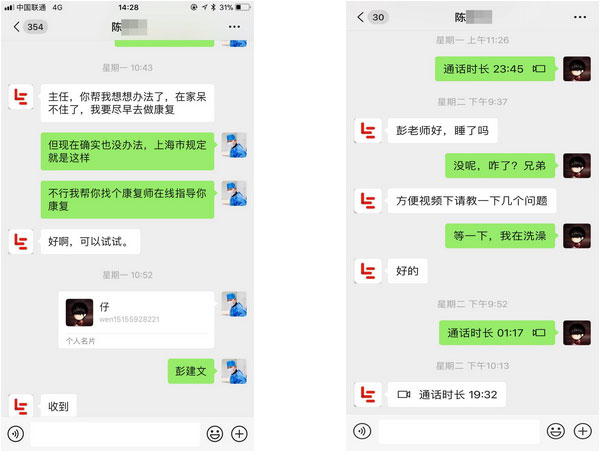 “主任,你幫我想想辦法,在家待不住了,我要盡早去做康復(fù)。”3月初,張琪博士的微信收到了患者的求助信息。他一邊安撫焦慮的患者,一邊馬上跟病區(qū)康復(fù)組長彭建文取得聯(lián)系。工作本來就很繁忙的彭建文二話不說,利用下班休息時(shí)間,通過微信為患者“直播”了一些簡單易操作的康復(fù)鍛煉動作要領(lǐng),幫患者解決了煩惱。