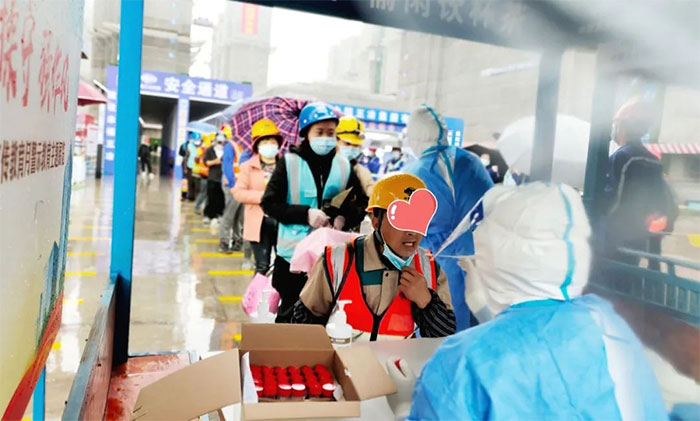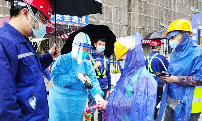 從下午一直忙到夜幕籠罩,兩人一遍又一遍重復(fù)著同樣的話語和動作。風(fēng)雨交織中,打濕了面罩,打濕了防護服,即使腰酸背痛,手臂僵硬,他們也沒有停下來一刻,心中只是默念著“快點,再快一點!”。哪怕讓工友們少淋一分鐘的雨,也是一種心頭的慰藉。