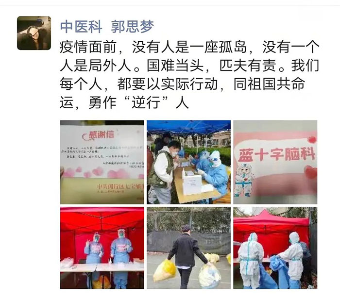 還有中醫(yī)科的郭思夢,已經(jīng)連續(xù)參加了8次志愿采樣工作。雖然每一次都累到“虛脫”,但她卻從未后悔過。“疫情面前,沒有人是一座孤島,沒有一個(gè)人是局外人。”“我們每個(gè)人,都要以實(shí)際行動,同祖國共命運(yùn),勇作‘逆行人’。”她在朋友圈里,用文字描述出了每一個(gè)藍(lán)十字人的心聲。