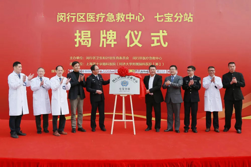 閔行區(qū)衛(wèi)計(jì)委副主任程佳(右五)、醫(yī)療急救中心主任徐中杰(左五)、副主任蔣超(右三)、上海市腦卒中院前急救主任委員劉建民(左四)、上海藍(lán)十字腦科醫(yī)院黨支部書記朱敏(右四)、院長項(xiàng)耀鈞(左三)等領(lǐng)導(dǎo)為七寶分站正式揭牌