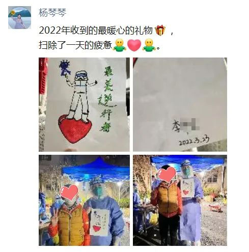 后來(lái)他告訴我,知道今天采核酸,他下午就一直在家里畫(huà)。畫(huà)好了看我們還在忙,就一直等著,說(shuō)怕打擾到我們。等一會(huì)不放心,怕我們走了,就來(lái)看一下,一直等了一個(gè)多小時(shí)。直到最后,我們剛結(jié)束,他就立刻送了過(guò)來(lái)。“是你們的付出才讓我們能夠安心在家”,他悄悄在我耳邊說(shuō)。