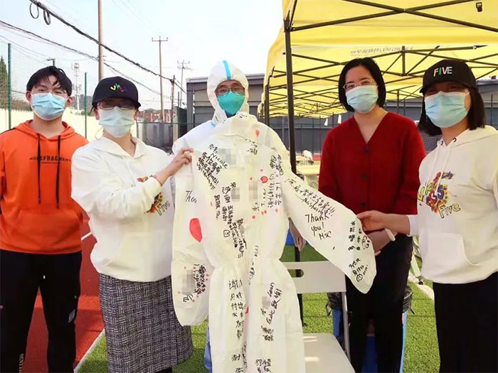 ▲ 寫(xiě)滿祝福語(yǔ)的防護(hù)服