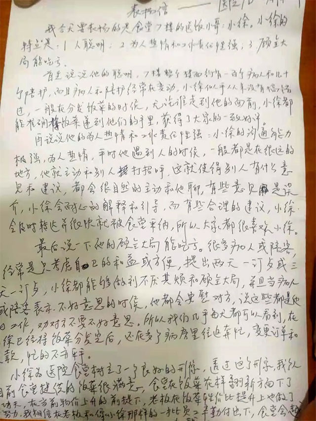 “我今天要表揚的是食堂7樓的送飯小哥:小徐。小徐的特點是,1. 人聰明,2. 為人熱情和責(zé)任性(心)強(qiáng),3. 顧全大局能吃虧......最后說一下顧全大局能吃虧。很多病人或陪客,經(jīng)常是只考慮自己的利益和方便,提出兩天一定餐,或三天一定餐,小徐都能夠做到不厭其煩和顧全大局,并且,當(dāng)病人和陪客表示,不好意思的時候,他都會安慰對方,說這些都是他的工作,勸對方不要不好意思。所以,我們幾乎每天都可以看到,在小徐已經(jīng)將飯菜分發(fā)完后,還在多個病房里往返奔忙,變更訂單和收款,忙的不亦樂乎。......”
