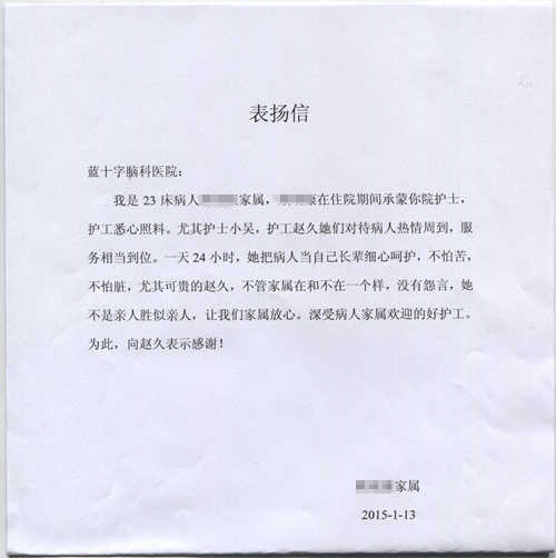 患者家屬寫(xiě)信表?yè)P(yáng)醫(yī)院護(hù)士和護(hù)工