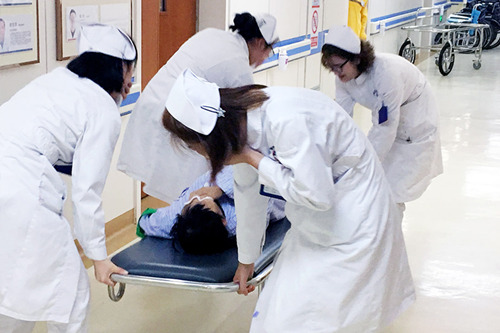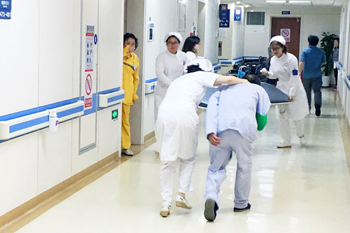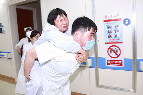 與此同時,為了增加演練的真實性,進行演練的兩個病區(qū)5A和4B,分別有5名特殊的病人“潛入”病區(qū),他們由醫(yī)院的后勤工作人員扮演。鑒于腦病患者的特殊性,有的癱瘓在床、神志不清,有的肢體偏癱、行動不便……這些扮演的病人均真實還原了病區(qū)患者的情況,佩戴綠袖標(biāo)分布于各病房等待救援。我院醫(yī)務(wù)人員及救援小組配合默契,采用“抬、背、抱、扶”等方式成功將這10位特殊的病人成功轉(zhuǎn)移。