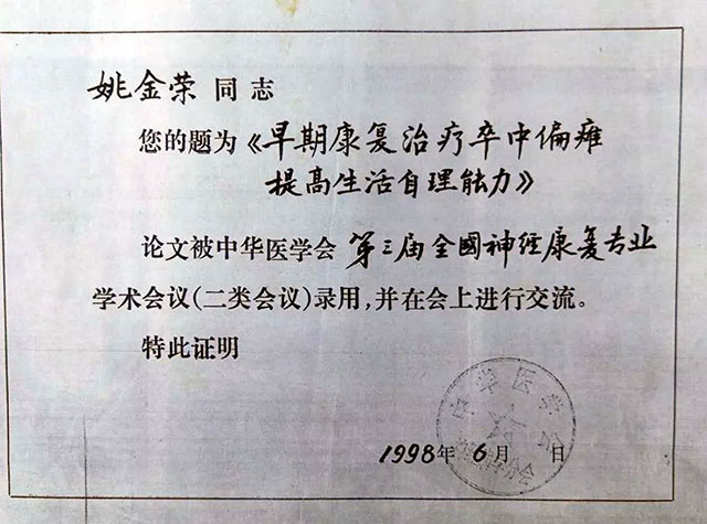 ▲ 在第三屆全國(guó)神經(jīng)康復(fù)專業(yè)學(xué)術(shù)會(huì)議上姚金榮發(fā)表論文證明