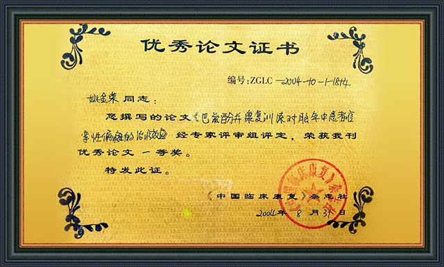 ▲ 2004年,姚金榮在《中國臨床康復(fù)》第八卷第10期《臨床研究》專欄上發(fā)表的論文并獲優(yōu)秀論文一等獎