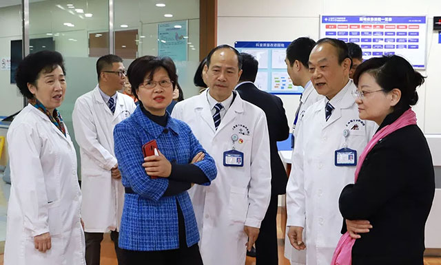 ▲ 2018年12月6日上海市衛(wèi)健委黨委書記黃紅女士(前排左二)參觀調(diào)研康復(fù)科與姚主任親切交談并關(guān)心科室發(fā)展