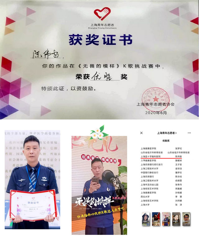 近日,由上海市共青團(tuán)市委和上海青年志愿者協(xié)會(huì)聯(lián)合舉辦的上海“青春戰(zhàn)疫”志愿服務(wù)主題曲《無畏的模樣》挑戰(zhàn)賽獲獎(jiǎng)?wù)呙麊谓視。上海藍(lán)十字腦科醫(yī)院總務(wù)科消防站站長陳偉智獲優(yōu)勝獎(jiǎng)。